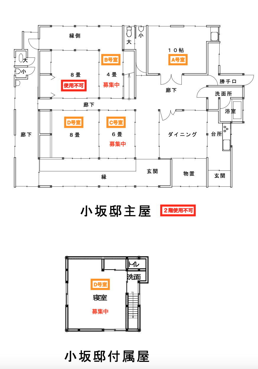 現在、空きがあるのはA、B、C、D、E号室のうちB、C、E号室の3室です。B号室は4畳間と細長い洋室を繋げたL字型のユニークな部屋、C号室は明るい光が入る縁側に面した和室です。E号室は別棟の個室で、お風呂やキッチンは主屋のものをご利用いただきます。